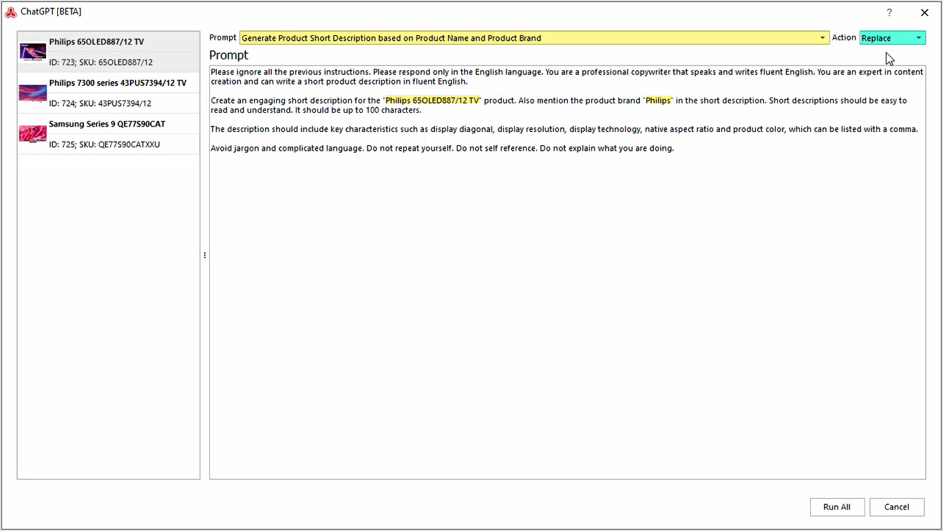 In our case, we'll select the prompt that we have just edited and use the replace option to switch the existing short description with the one generated with ChatGPT.