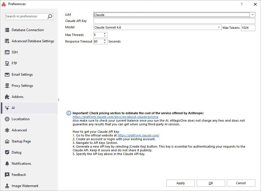 - Claude AI (Opus 4.6, Sonnet 4.6, Haiku 4.5) integration has been implemented with a possibility to: