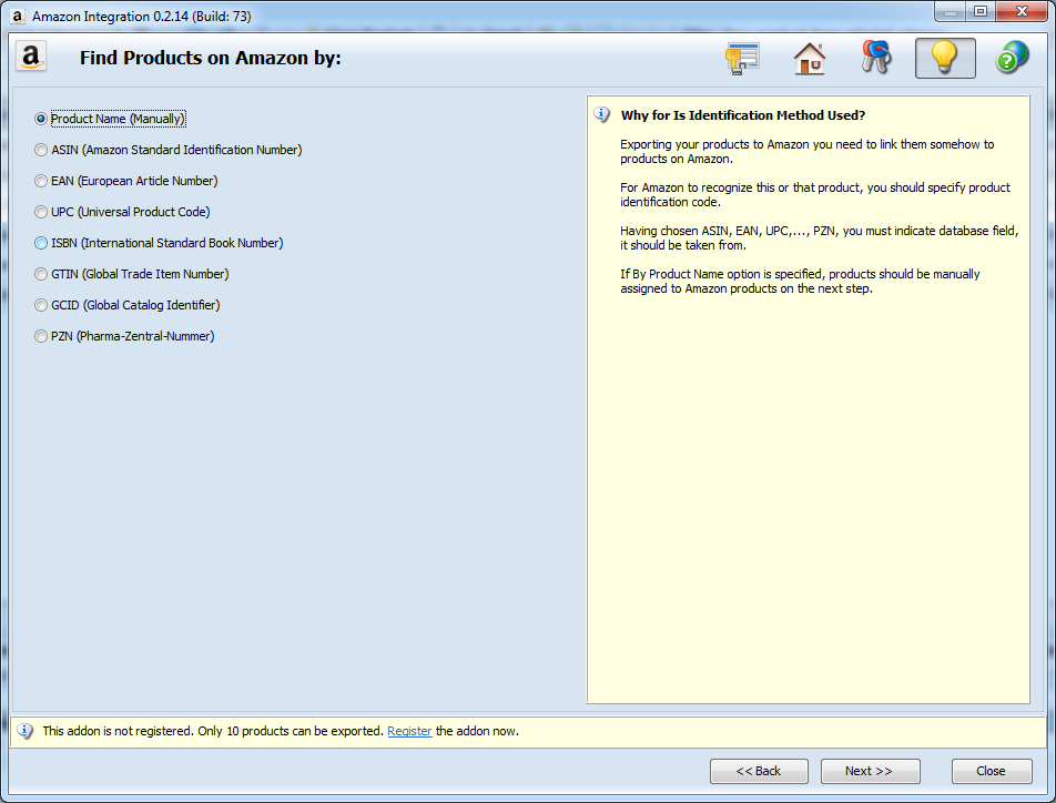 - Specify the identifier to search products by at Amazon (product name, ASIN, EAN, UPC, GTIN or other).